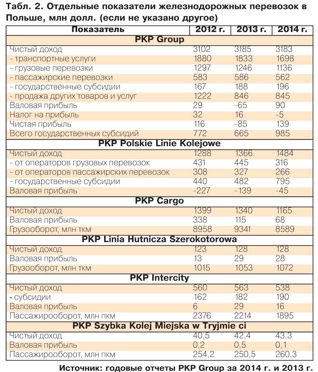 Созданная группа состоит из материнской компании - PKP SA и 11 компаний, представляющих отдельные виды железнодорожных услуг, таких, как крупнейший оператор грузовых перевозок PKP Cargo, оператор пассажирских междугородных перевозок PKP Intercity и др. Показатели деятельности группы компаний PKP приведены в табл. 2.