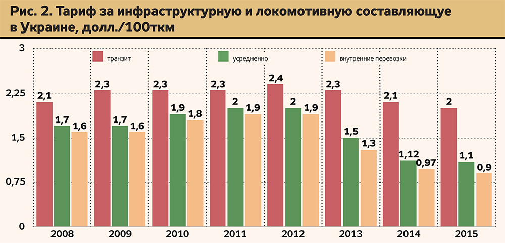 В результате можно установить, что с учетом поправки на доходы от вагонной составляющей размер тарифа инфраструктурной и локомотивной составляющих в Украине в 2012–2013 гг. составлял 2,0 долл./100 км, а 2014-м - 1,5 долл. (см. табл. 1). В 2015 г. он снизился до 1,12 долл./100 км, в том числе на внутренние перевозки - до 0,97 долл., тогда как в РФ общий тариф составлял