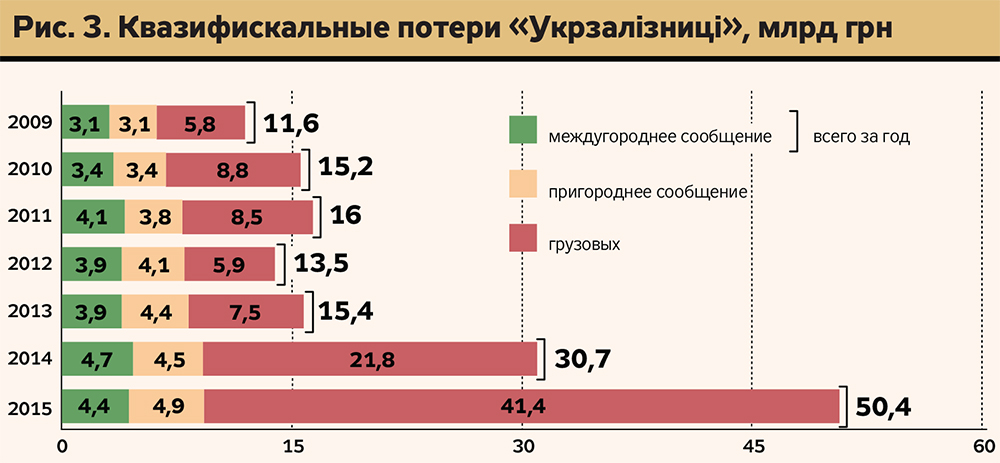 Поскольку в сфере пассажирских перевозок отсутствуют услуги, которые не подпадали бы под регулирование государства, за объем квазифискальных операций взяты убытки этого вида перевозок, скорректированные на недоначисленный НДС. Установлено, что соответствующие потери "Укрзалізниці" на протяжении 2009–2015 гг. составили 54 млрд грн (в т.ч. 28,3 млрд от пригородных перевозок и 27,5 млрд. - от междугородных).