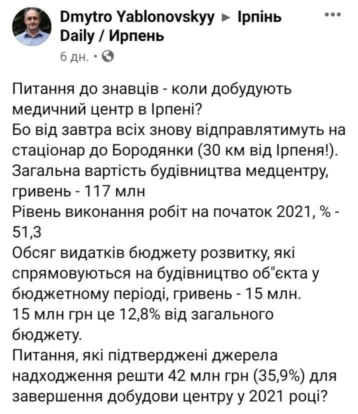 На днях житель Ирпеня Дмитрий Яблоновский задал вполне справедливый вопрос в социальной сети Фейсбук. В частности он сомневается, что есть подтвержденные источники поступления средств, необходимые для завершения строительства медицинского центра в Ирпене.