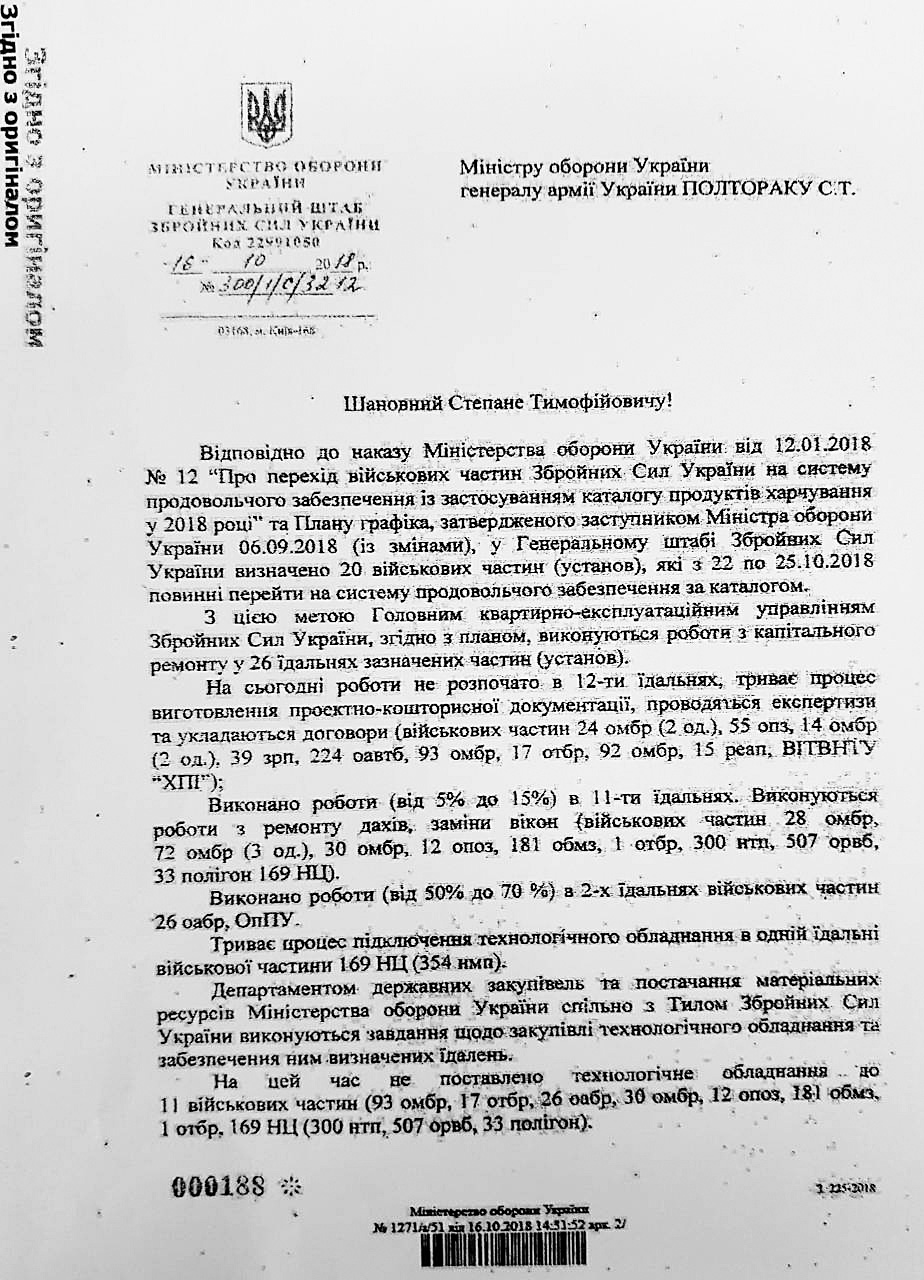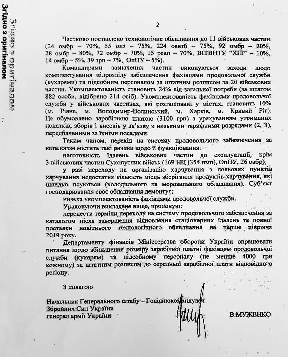 Возникающие вопросы достигли такого масштаба, что 16 октября с.г. начальник Генштаба снова писал министру обороны: "Переход на систему продовольственного обеспечения по каталогу содержит такие риски относительно ее функционирования: неготовность столовых войсковых частей к эксплуатации <…>; низкая укомплектованность специалистами продовольственной службы". Виктор Муженко еще раз пытается объяснить Степану Полтораку, что повара не будут работать за существующую зарплату в 3100 грн ("укомплектованность специалистами продовольственной службы войсковых частей, которые размещены в городах, составляет 10%").
