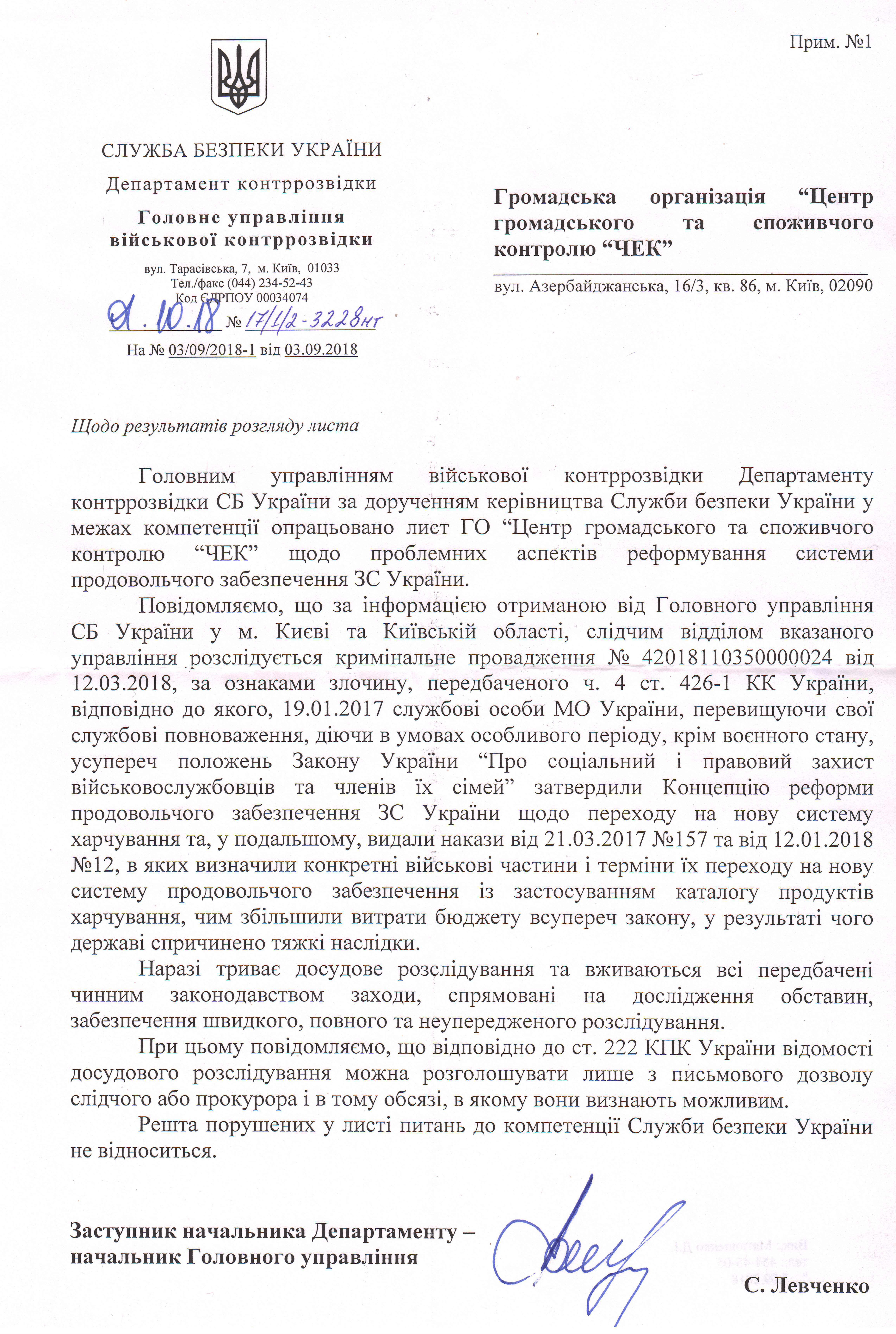 У подозрения, что новая система питания с ананасами - граната "не той системы", есть еще одно основание. Следственным отделом Главного управления СБУ в Киеве и Киевской области "расследуется уголовное производство №42018110350000024 от 12.03.2018", - официально сообщает заместитель начальника департамента контрразведки СБУ, начальник Главного управления военной контрразведки Сергей Левченко. "По признакам преступления, - раскрывает суть дела генерал-майор, - предусмотренного ч.2 ст.426-1 УК Украины, в соответствии с которой 19.01.2017 должностные лица МО Украины, превышая свои служебные полномочия, действуя в условиях особого периода, кроме военного положения, вопреки положениям Закона Украины "О социальной и правовой защите военнослужащих и членов их семей" утвердили Концепцию реформы продовольственного обеспечения ЗС Украины касательно перехода на новую систему питания и, в дальнейшем, издали приказы от 21.03.2017 №157 и от 12.01.2018 №12, в каковых определили конкретные воинские части и сроки их перехода на новую систему продовольственного обеспечения с применением каталога продуктов питания, из-за чего увеличили затраты бюджета вопреки закону, в результате чего государство испытало тяжелые последствия. В настоящее время продолжается досудебное расследование и используются все предусмотренные действующим законодательством мероприятия".