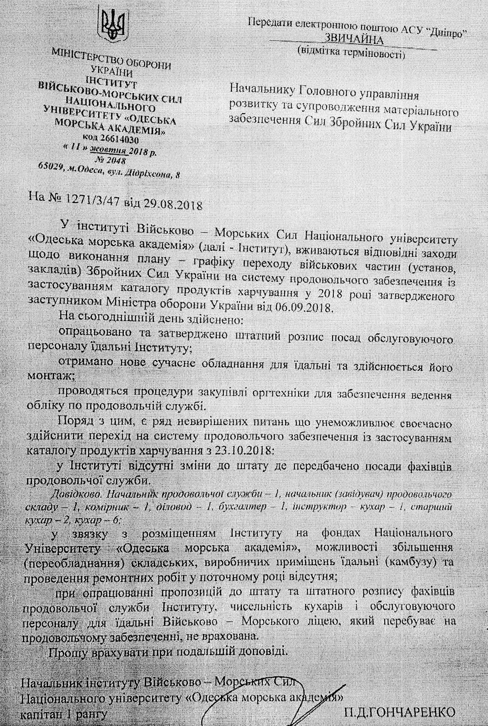 "Существует ряд нерешенных вопросов, что исключает возможность своевременного перехода на систему продовольственного обеспечения с применением каталога", - писал также 11 октября с.г. начальник Института Военно-Морских сил Национального университета "Одесская морская академия" капитан 1 ранга Петр Гончаренко начальнику Главного управления развития и сопровождения материального обеспечения ВСУ Дмитрию Марченко. Среди "нерешенных вопросов" - отсутствие предусмотренных штатным расписанием специалистов, а также производственных помещений камбуза.