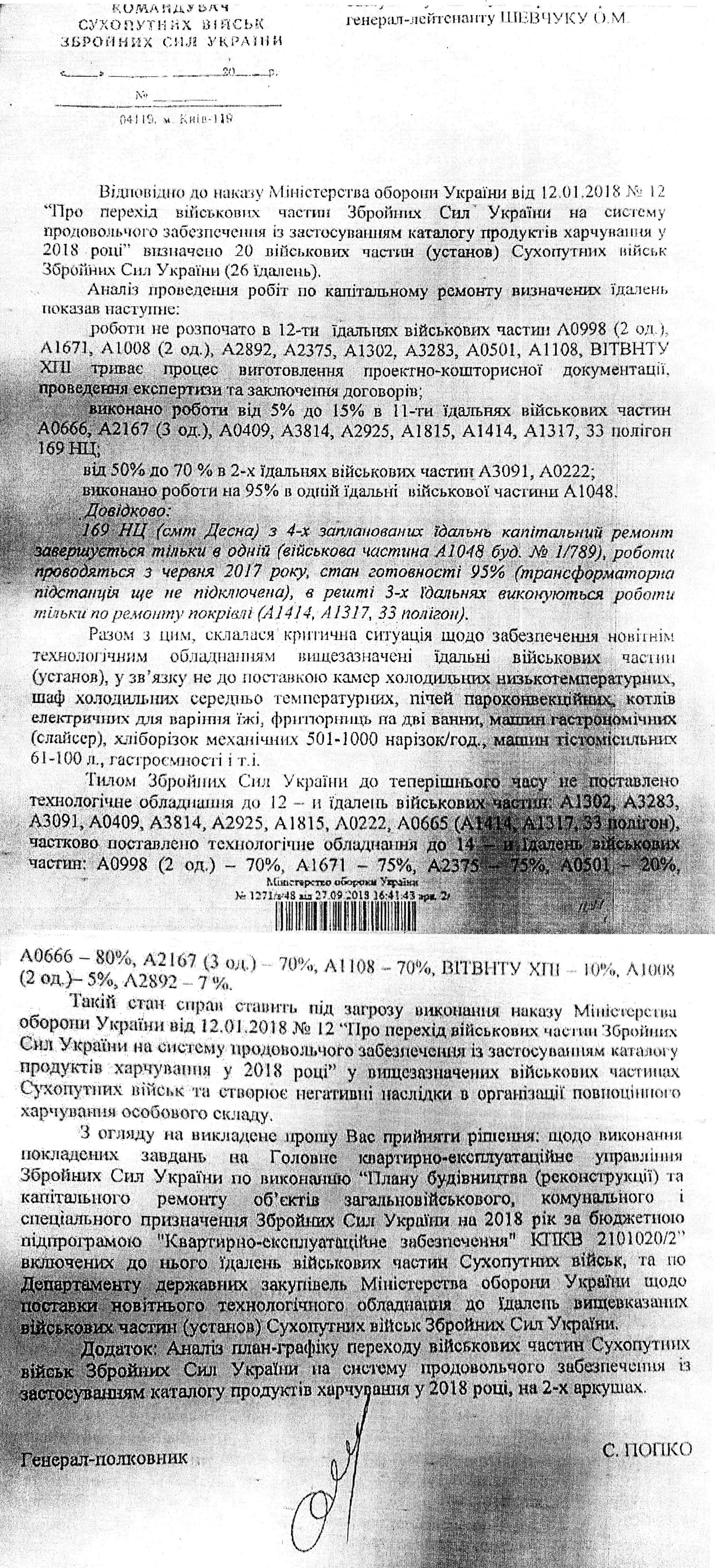Мы не сомневаемся, что главковерха накормили хорошо, но вынуждены учитывать не только реакцию вкусовых рецепторов. "Работы не начаты в 12 столовых войсковых частей…"; "выполнены работы от 5 до 15% в 11 столовых войсковых частей…"; "169 УЦ (пгт Десна) из 4-х запланированных столовых капитальный ремонт завершается только в одной…"; "создалась критическая ситуация касательно обеспечения новым технологическим оборудованием вышеуказанных столовых..." Это - выдержки из письма командующего Сухопутными войсками генерал-полковника Сергея Попко заместителю министра обороны генерал-лейтенанту Олегу Шевчуку. "Такое положение вещей ставит под угрозу выполнение приказа Министерства обороны №12 от 12.01.2018, - предупреждает Попко. - И создает негативные последствия в организации полноценного питания личного состава". Документ датирован 27 сентября с.г. - за месяц до объявленного перехода частей ВСУ на питание "по-новому".