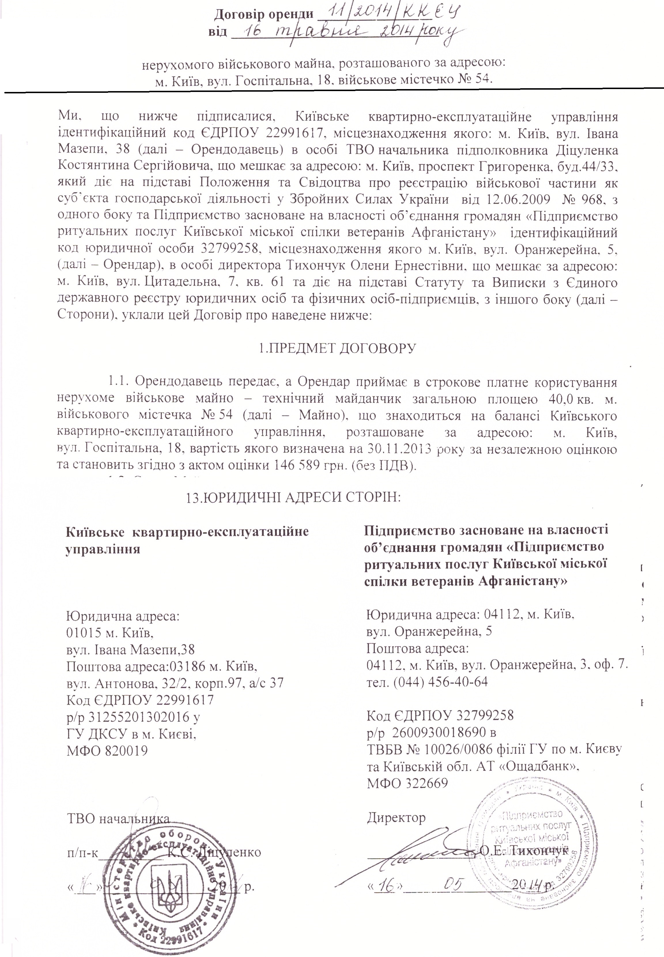 Чтобы разобраться в перипетиях указанной проблемы, мы сделали официальный запрос начальнику ККЭУ К. Дицуленко о предоставлении публичной информации - договора аренды с Предприятием ритуальных услуг Киевского городского союза ветеранов Афганистана (далее - Предприятие), чьи "титушки" участвовали в конфликте у госпитального морга.