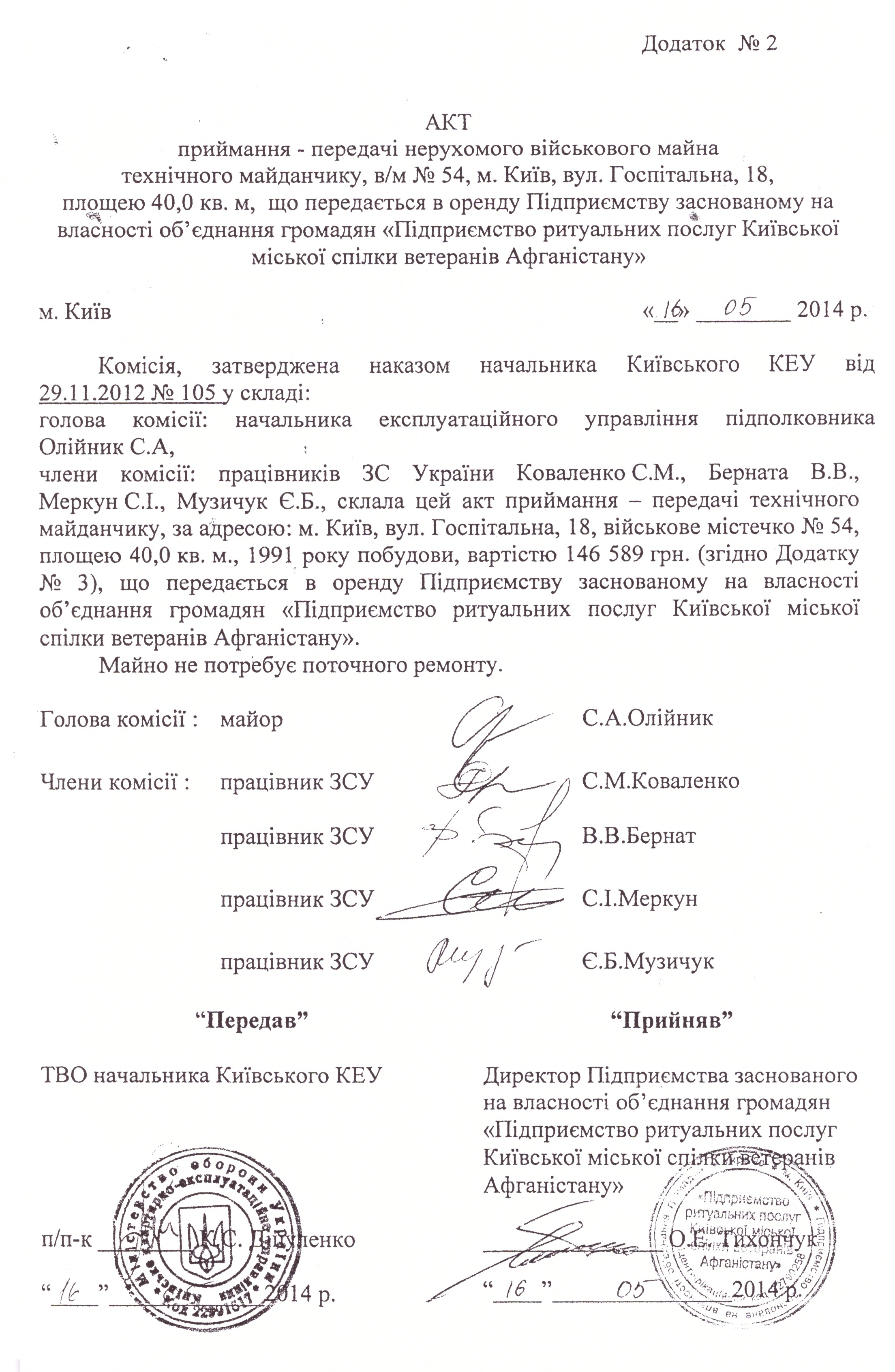 В феврале 2013 года к заместителю министра обороны А.Бабенко от имени Киевского городского союза ветеранов Афганистана обратилась директор Предприятия Е.Тихончук. Она попросила предоставить в здании госпитального морга Центральной патологоанатомической лаборатории МО Украины (ЦПАЛ) помещение до 25 кв. м для аренды или разместить ее киоск площадью до 30 кв. м возле морга. В качестве бонуса Е.Тихончук предложила маркетинговую "фишку" - систему скидок на похоронный сервис для военнослужащих.
