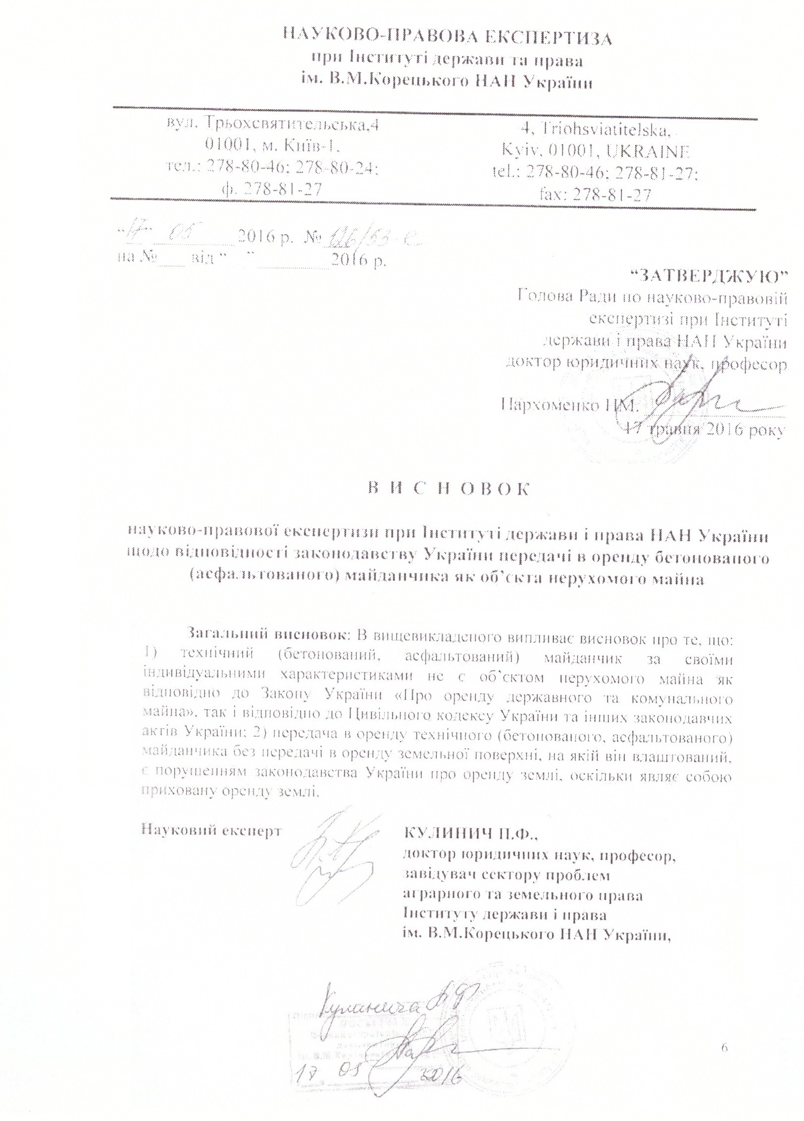 Чтобы прояснить ситуацию о законности передачи в аренду асфальтированной технической площадки, в Институте государства и права им. В.Корецкого НАН Украины была проведена научно-правовая экспертиза.