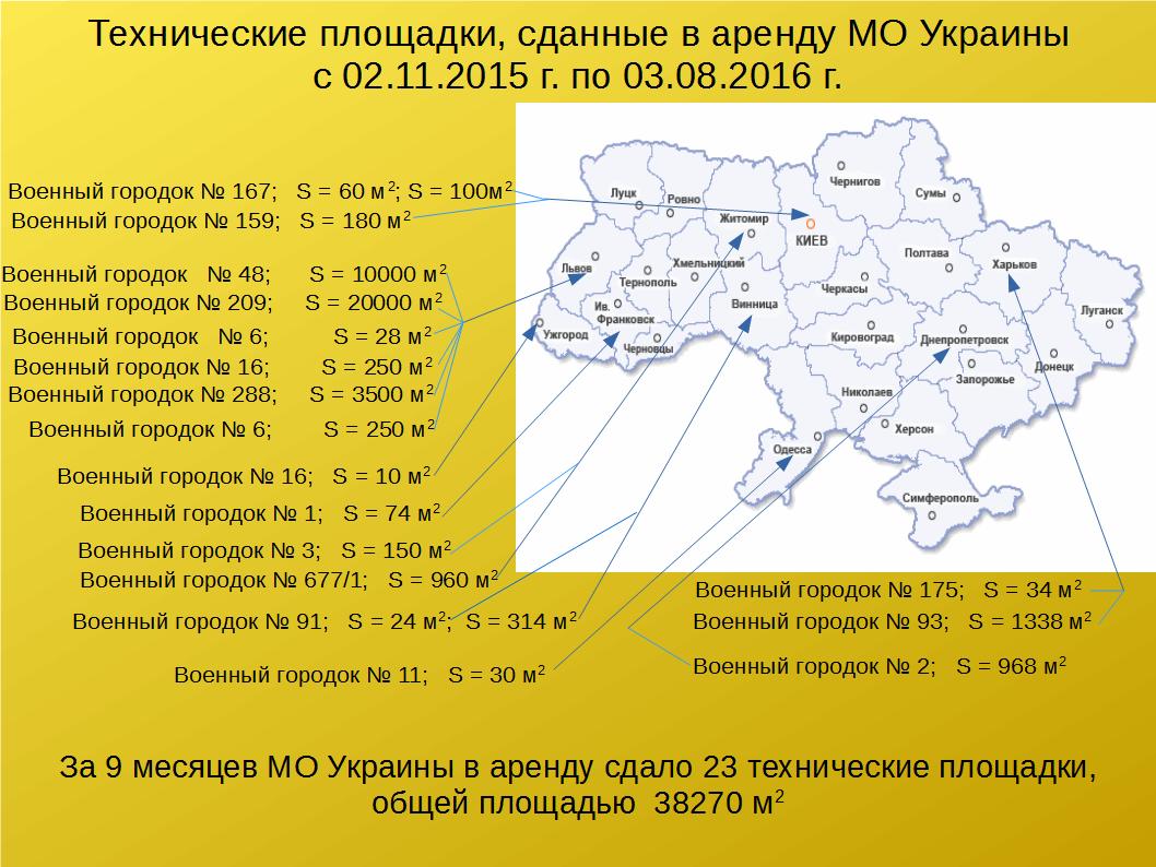 Осуществленный нами мониторинг материалов газеты Фонда государственного имущества "Ведомости приватизации" показал, что выявленный случай сдачи в скрытую аренду земли военным ведомством - типичная практика, распространенная по всей стране. Официальный источник Фонда государственного имущества свидетельствует о том, что с ноября 2015-го по август 2016 г. квартирно-эксплуатационные службы МО Украины сдали в скрытую аренду (под видом технических площадок) 23 земельных участка, принадлежащих государству (территориальным громадам), общей площадью 38270 кв. м.