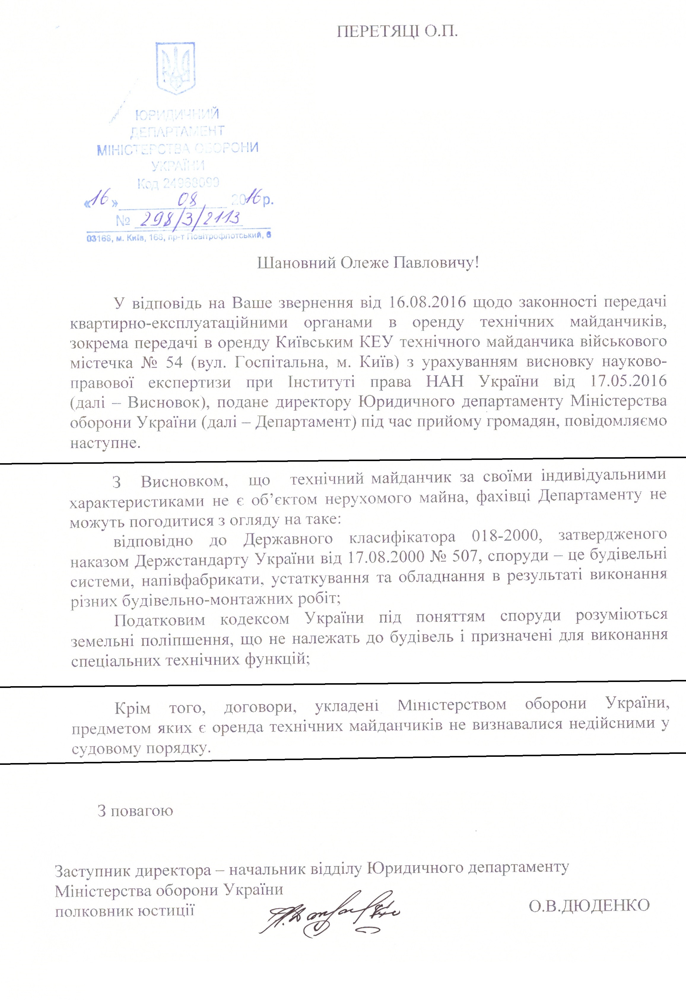 При повторном обращении к руководству ККЭУ с просьбой прояснить ситуацию с арендой технической площадки вновь был получен отказ. Пришлось прийти на личный прием к директору юридического департамента МО Украины Валерию Ковалю. Последний комментировать тему также не захотел и поручил своему заместителю - начальнику юридического отдела Александру Дюденко разобраться и подготовить официальный ответ.