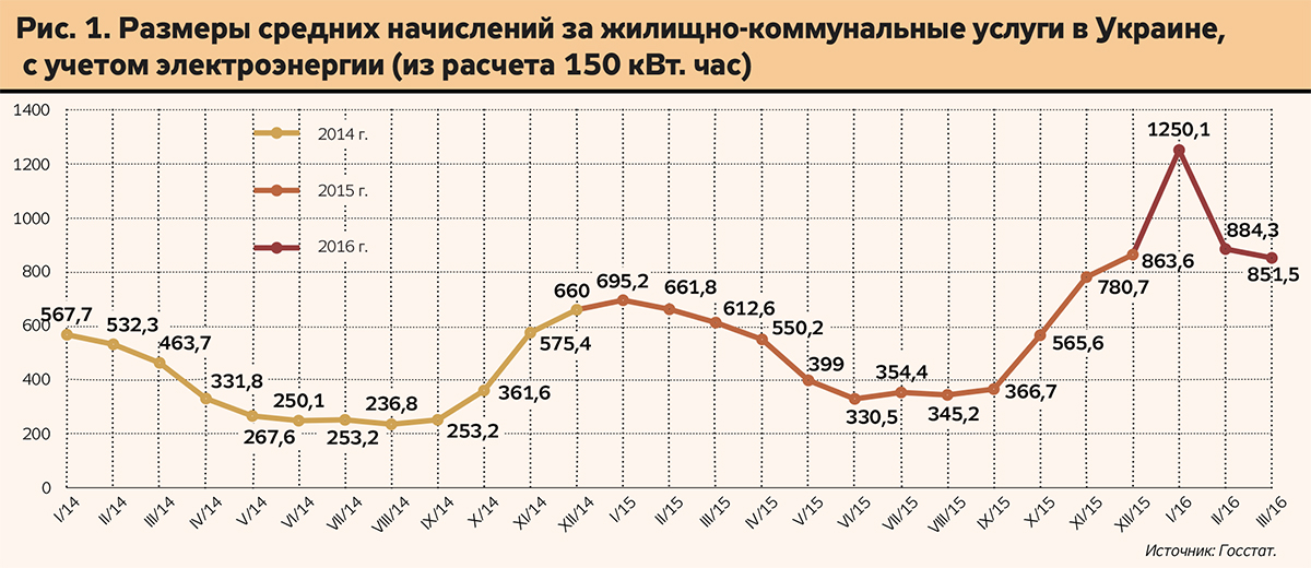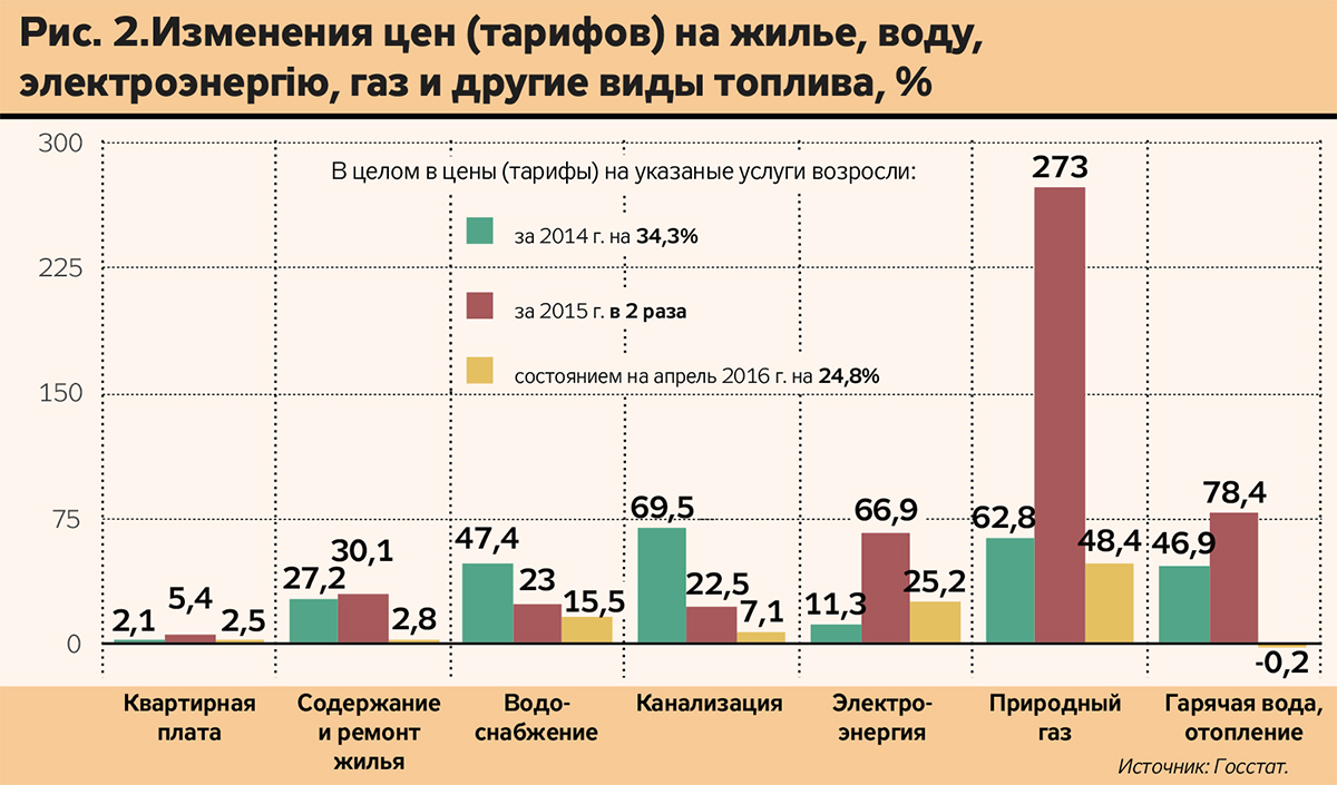 По данным Госстата, тарифы на жилье, воду, электроэнергию, газ и другие виды топлива в 2015-м выросли в целом в два раза и почти на 25% - по состоянию на апрель текущего года. Средние начисления за коммунальные услуги в марте 2016-го по сравнению с мартом 2015-го увеличились на 39%, а по сравнению с аналогом 2014-го - на 84%. Вместе с тем до конца текущего года потребители еще не раз удивятся счетам в своих платежках.