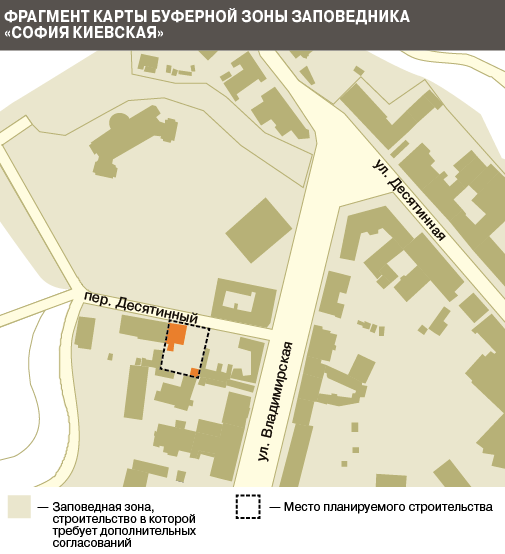 2. Этот адрес входит в так называемую буферную зону Софии Киевской и причисляется к особо ценным местам культурного наследия. Ранее представители застройщика заявляли, что данный участок к буферной зоне не относится - противники же строительства настаивали на обратном. Проверка ZN.UA заняла больше времени, чем ожидалось: в самом заповеднике "София Киевская" нам пояснили, что без точного плана работ утверждать ничего нельзя, поскольку участок по соответствующему адресу может быть как на территории зоны, так и за ее пределами и посоветовали найти издание Научно-исследовательского института памятникоохранных исследований "Историко-градостроительные исследования Киева". Мы нашли и проверили по картам: участок таки попадает в "буфер" заповедника, пусть и находится на самой ее границе. Вышеупомянутые здания не выделены как представляющие какую-либо особую ценность, однако если участок попадает в такую зону, то для строительства необходимо разрешение Верховной Рады и одобрение ЮНЕСКО.