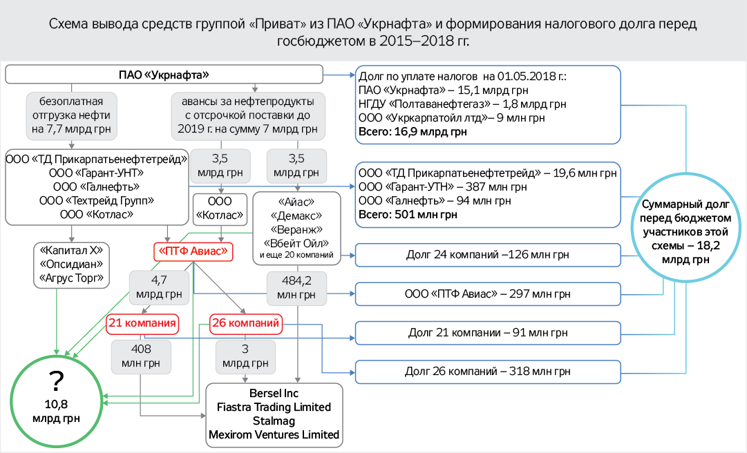 Из 254 участников схемы 80 компаний в 2013–2015 гг. управляли в общей сложности 716 АЗС группы "Приват" под брендами ANP, "Авиас", Rubix, "Юкон", "Мавекс" в 21 области. Только с предприятиями "Привата" имели дело и упомянутые выше нерезиденты, получившие в итоге деньги "Укрнафты".