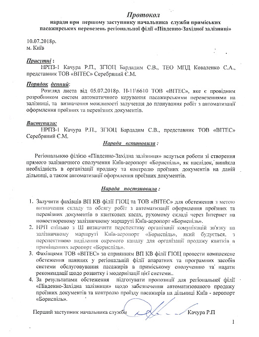 Согласно протоколу "Південно-Західної залізниці", первая встреча по вопросу билетного сервиса с ООО "Виртуальные технологии и системы" состоялась еще 10 июня. Других разработчиков программного обеспечения на это мероприятие не приглашали.