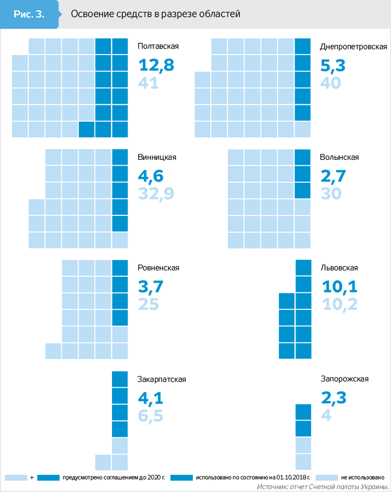 Свыше 88% выделенных кредитных денег (189,5 млн долл.) в виде субвенции должны были быть направлены в восемь областей. Однако, по данным Счетной палаты, за 2015–2017 гг. и три квартала 2018-го регионы получили лишь 28% положенных средств, или 52,8 млн долл. (см. рис. 1). Причем из них потратили только 45,5 млн долл., а 7,3 млн остались на счетах местных бюджетов как невостребованные.