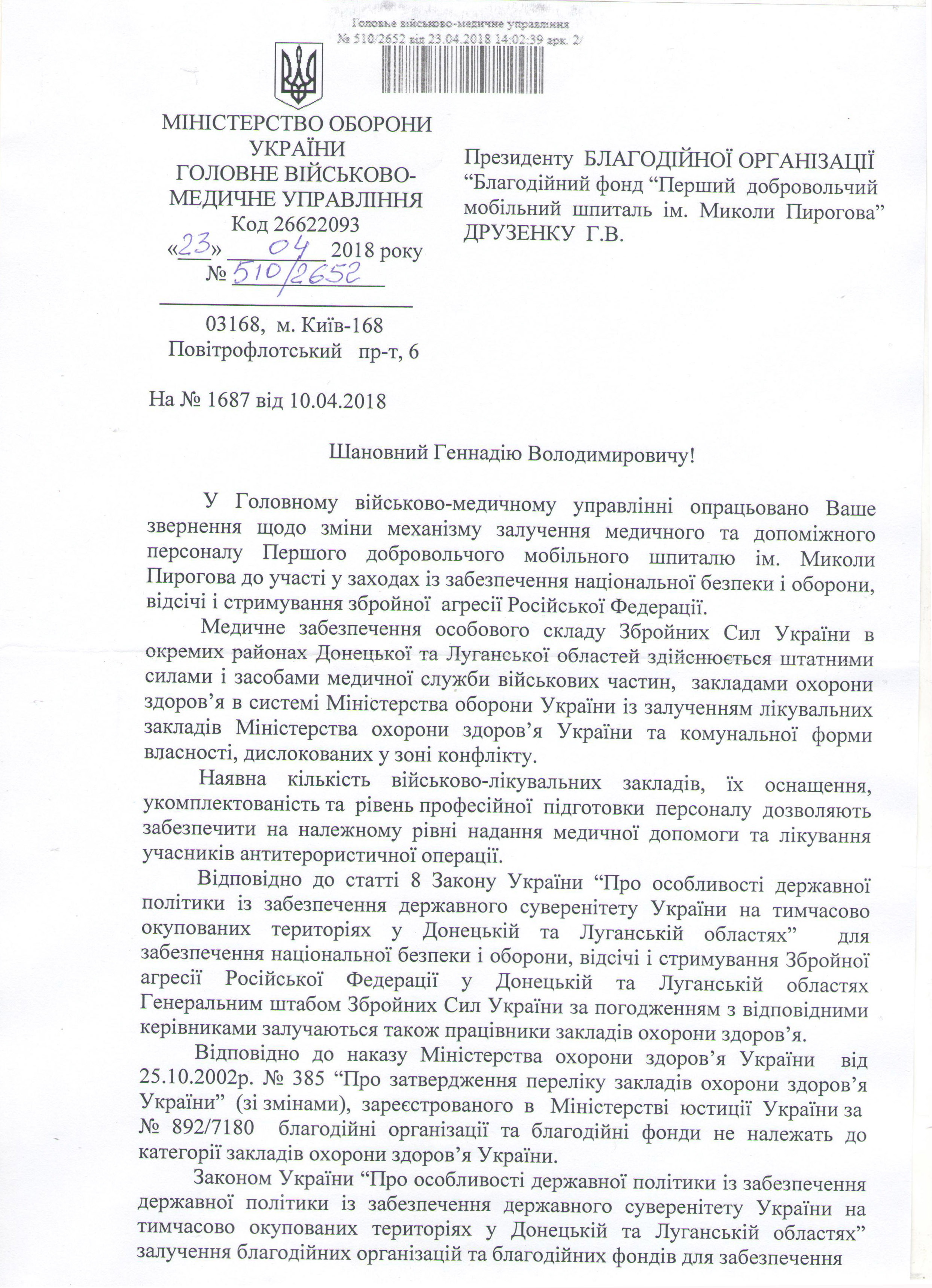 Это письмо очень удивило медиков-добровольцев ПДМГ, четвертый год оказывающих помощь в зоне боевых действий военнослужащим ВСУ, работникам правоохранительных органов и гражданскому населению. Утверждение господина Хоменко (до назначения на должность начальника ГВМУ работавшего главным хирургом Минобороны Главного военно-клинического госпиталя в Киеве) прямо противоречит заявлению начальника отдела медицинского обеспечения штаба АТО/ООС, в котором тот просит руководство ПДМГ откомандировать в апреле-мае текущего года 32 медика-добровольца ПДМГ и два автомобиля скорой помощи на усиление медицинской службы ВСУ в районах проведения АТО/ООС (письмо № 195_медз от 4 апреля 2018 г.).