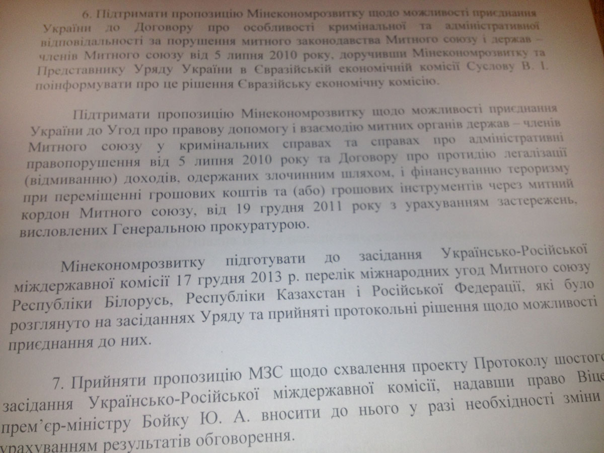 А п. 6 этого документа гласит: "Поддержать предложение Минэкономразвития относительно возможности присоединения Украины к Договору об особенностях уголовной и административной ответственности за нарушение таможенного законодательства Таможенного союза и государств - членов Таможенного союза от 5 июля 2010 г., поручив Минэкономразвития и представителю правительства Украины в Евразийской экономической комиссии Суслову В.И. проинформировать об этом решении Евразийскую экономическую комиссию.