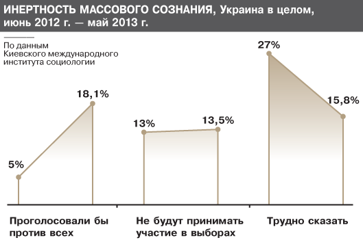 - До сенсации этому факту еще далеко, - комментирует генеральный директор Киевского международного института социологии Владимир Паниотто. - До выборов еще два года, и никто не знает, каковы будут списки претендентов на президентский пост. На прошлых выборах в списке было 18 кандидатов, на будущих, наверное, - не меньше, и если среди них будет много оппозиционных кандидатов, то произойдет "распыление" голосов. По результатам партийной части прошлых выборов можно утверждать, что за оппозицию у нас в стране выступают около 55% населения, а 45% - за коммунистов и Партию регионов. Однако стоит обратить внимание на большое количество граждан на Юге и Востоке страны, заявивших, что проголосуют против всех. Многие не хотят голосовать за Януковича, но, вероятно, будут вынуждены, не видя альтернативы.