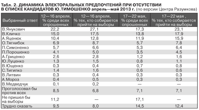 С 17 по 22 мая социологическая служба Центра Разумкова совместно с Фондом "Демократические инициативы" имени Илька Кучерива провели исследование избирательных настроений граждан относительно выборов президента. 2010 респондентам предлагались два списка - в первом из них среди кандидатов была представлена Юлия Тимошенко, а во второй список она не была включена (см.табл.1).