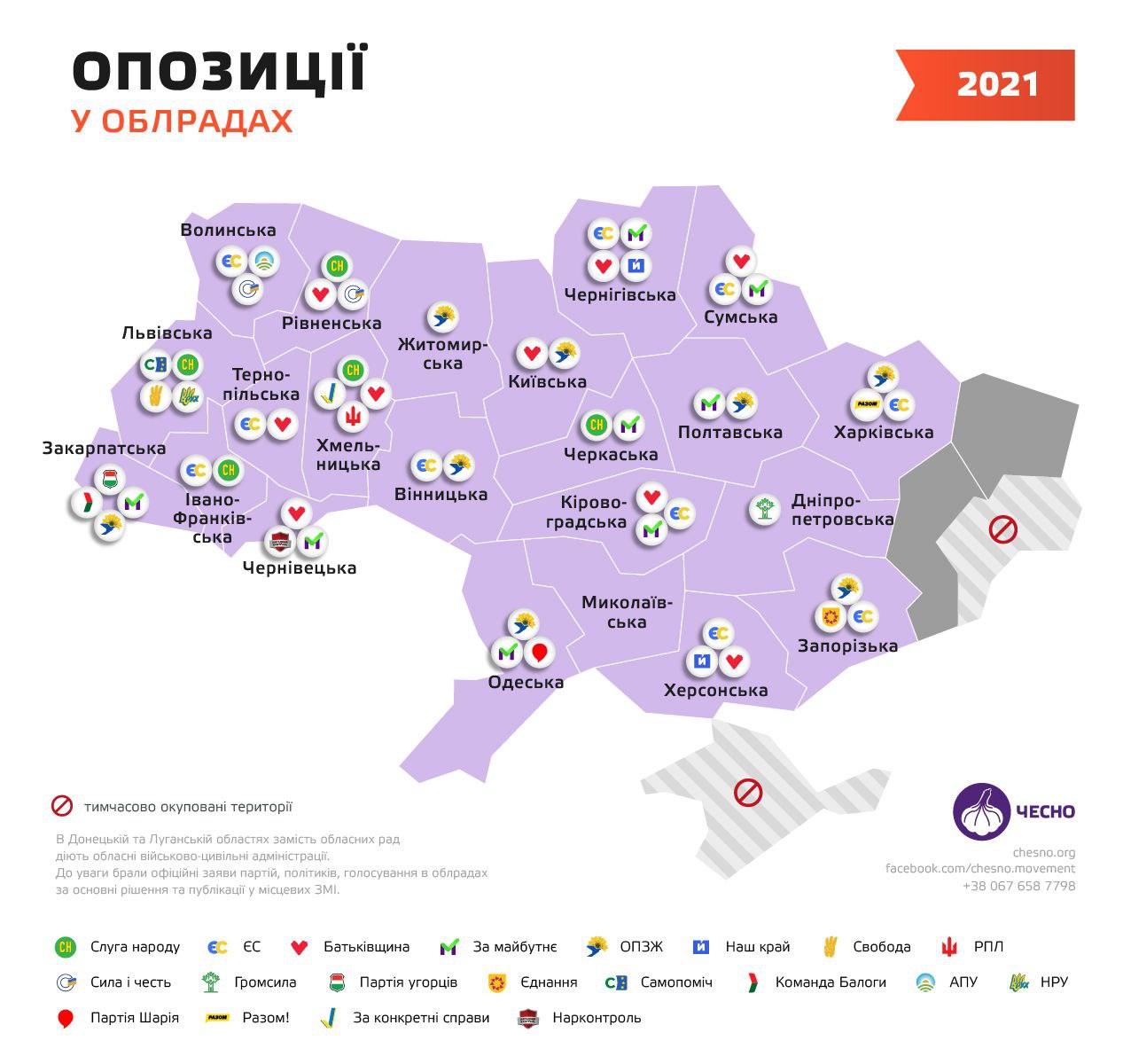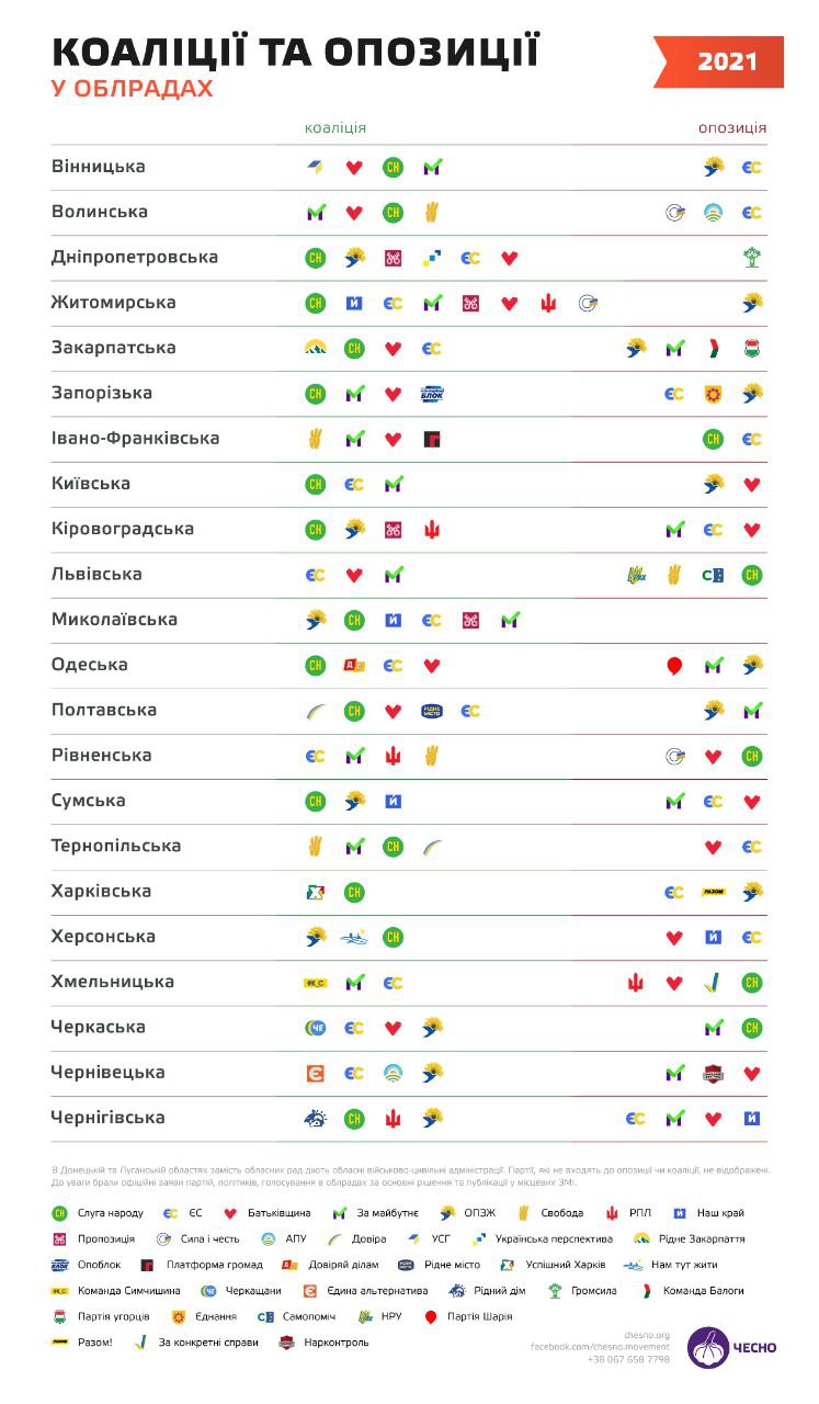 Таким образом, одни и те же партии могут быть и в оппозиции, и в коалиции в разных областях Украины. Это говорит об отсутствии борьбы идеологий партий и свидетельствует о том, что отдельные бизнес-группы договариваются о распределении ресурсов и влиянии на местах.