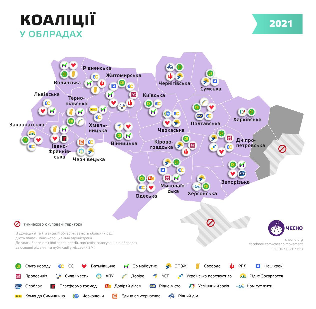 Однако возможны ситуации, когда коалиции на местах доказывают, что национальная политика на местную не влияет и «Слуга народа» может быть партнером «Европейской солидарности», а «Европейская солидарность» — ОПЗЖ. Бывает, что фракция партии центральной власти вообще раскалывается, как в Черновицкой области.