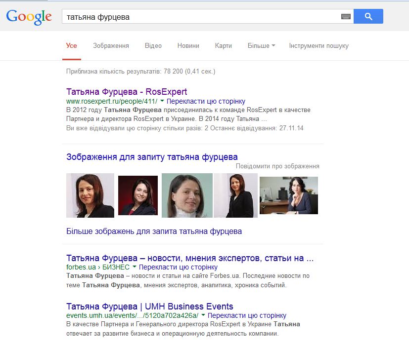 Ссылка на зачищенную страницу пока еще на первом месте в поисковике Google при поиске "Татьяна Фурцева". "Чистильщики" явно спешили – во "второстепенных" закладках сайта на утро субботы еще оставался контент (интервью и новости) о Т.Фурцевой как старшем партнере российской компании и генеральном директоре "Росэксперта" в Украине.