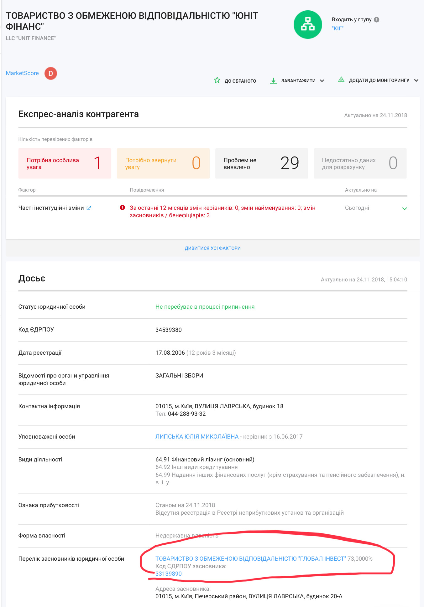 А основатель "Юнит Финанса", согласно данным сервиса Youcontrol, - то же ООО "Глобал Инвест", также зарегистрированное на Кипре.