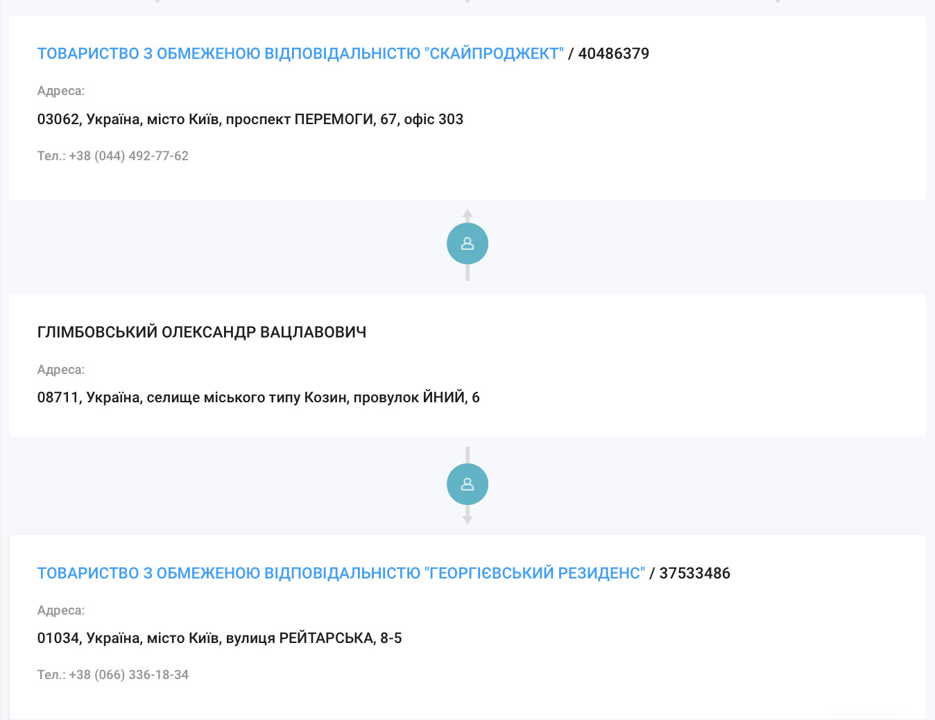 Половина уставного капитала ООО "Георгиевский резиденс" принадлежит Александру Глимбовскому, тестю экс-председателя ГФС Романа Насирова. Остальные 50% - сестре народного депутата Олеся Довгого Оксане Гуляевой через ООО "Рейтерс".