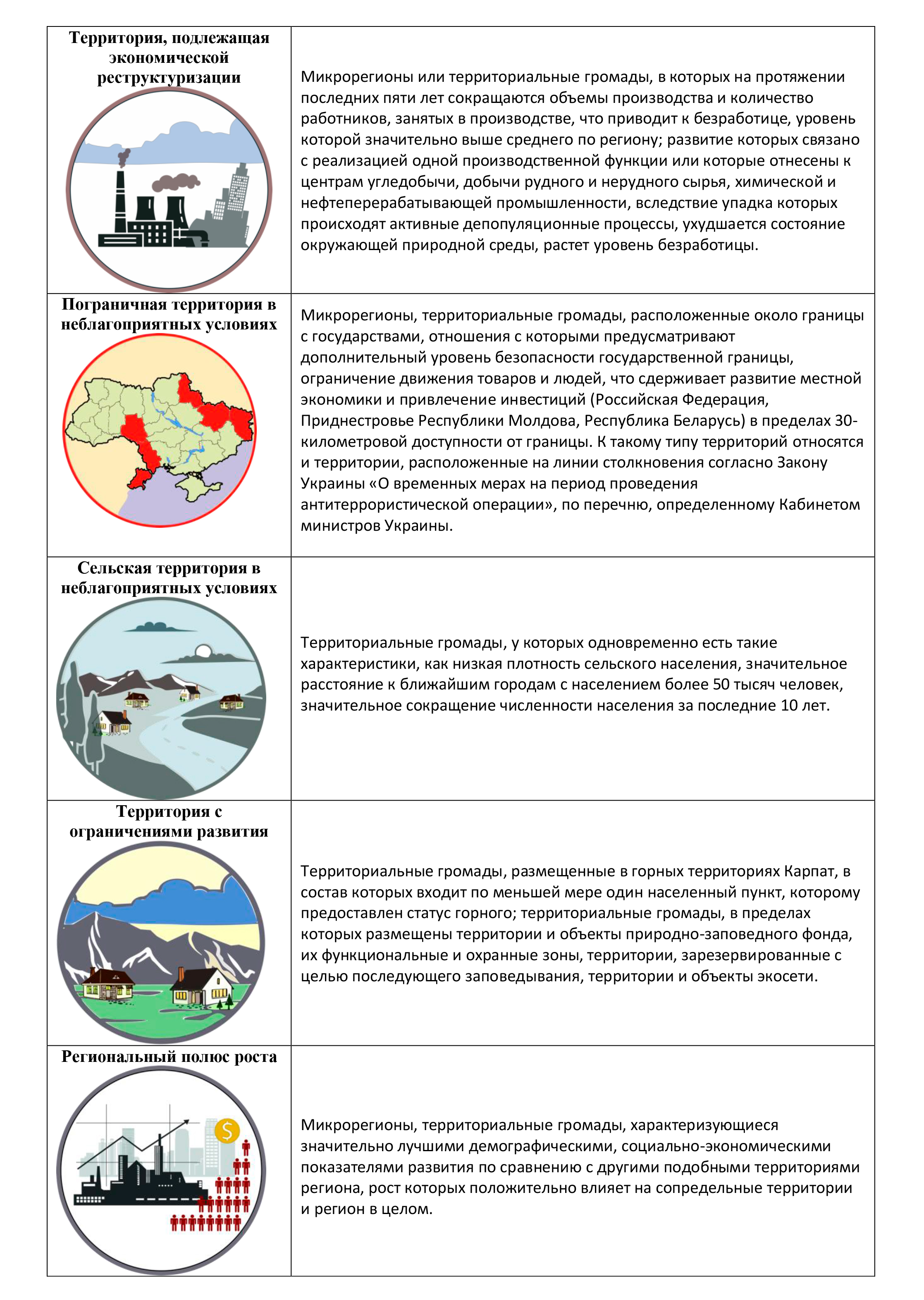 Почему возникла потребность в идентификации таких территорий? Потому что в разных областях есть определенные территории, имеющие общие признаки, а следовательно, они нуждаются в определенных инструментах поддержки, которые также будут иметь общие или одинаковые подходы к таким территориям, независимо от места их размещения. Ведь если в громаде плотность населения очень маленькая, около 10–15 человек на квадратный километр, то независимо от того, где такая громада располагается, вопросы доступности ее жителей к публичным услугам, городам и рынкам, к социализации являются общими.