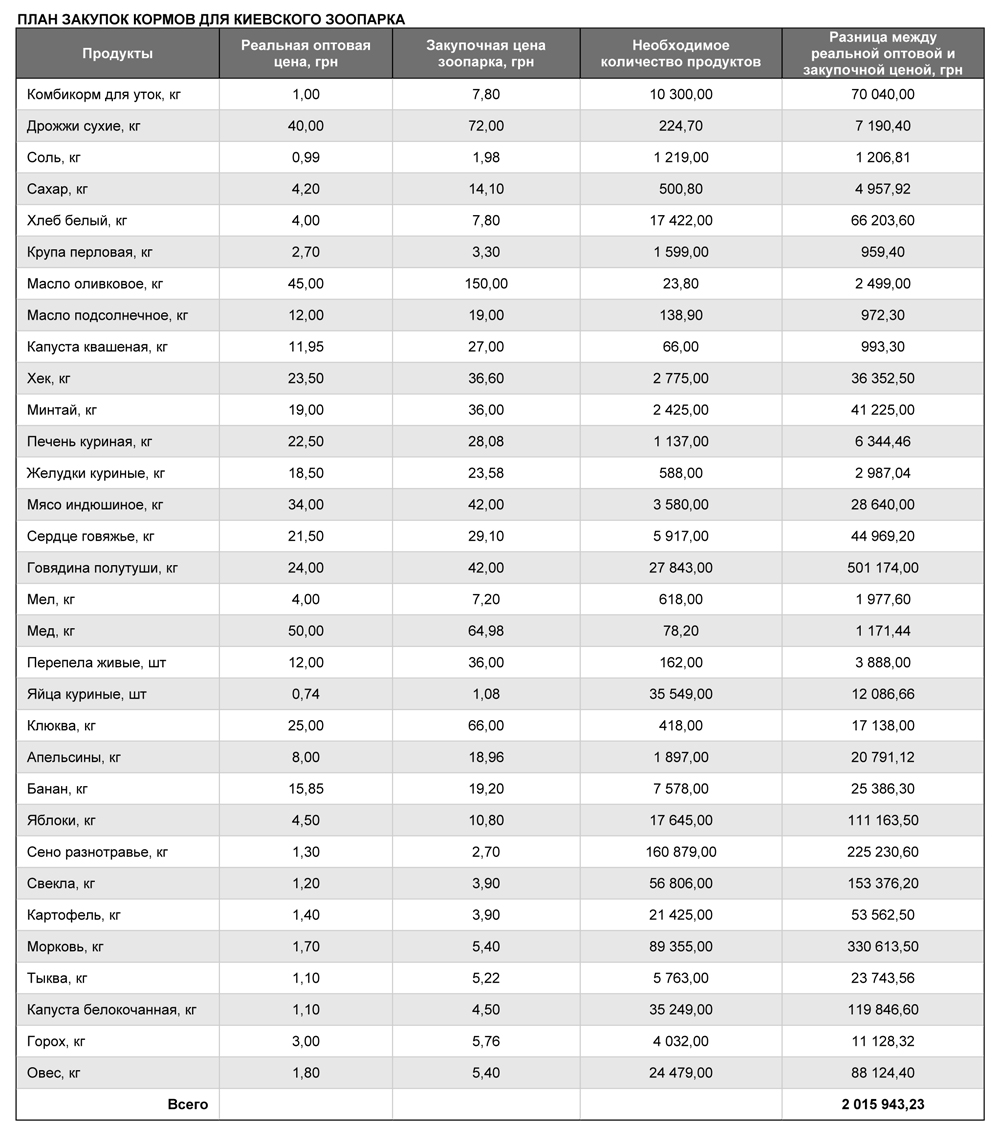 Помните, как г-н Кирилюк плакался депутатам, что зоопарк потратил на корма 7,6 млн грн? Но депутаты в силу своей занятости, некомпетентности или нежелания не удосужились попросить директора с этого места углубиться в подробности. А зря. Ибо криминальное чтиво под названием "План придбання кормів на 2013 рік по Київському зоопарку" никого не оставит равнодушным. Ни сотрудников УБЭП, ни домохозяйку, экономно ведущей семейный бюджет, ни премьер-министра Николая Азарова, который столь ревностно печется о снижении цен на продукты питания. Не говоря уже о Викторе Януковиче, для которого одними из главных приоритетов являются экономия бюджетных средств и беспощадная борьба с коррупцией.