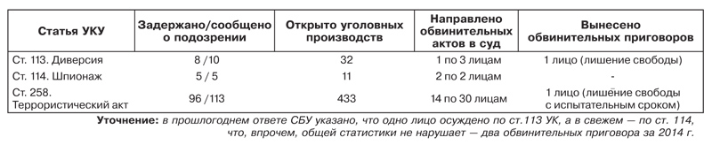 Увы, но данные, полученные автором от самой СБУ, разительно отличаются от приведенных президентом и положенных им в основу высокой оценки. Еще в конце прошлого года, столкнувшись в реестре судебных решений с отдельными курьезными случаями освобождения от уголовной ответственности лиц, привлекавшихся по статьям Уголовного кодекса о шпионаже, диверсиях и террористических актах (ст. 113, 114, 258 УКУ), в СБУ был направлен информационный запрос и получен ответ. Для получения более полной картины в этом году был подан такой же запрос, и 2 апреля пришел ответ СБУ. Таким образом, мы располагаем данными за 2014 г. (с начала АТО) и первый квартал т.г.