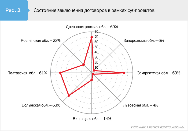 Зато 50 договоров стоимостью почти 3 млн долл. облгосадминистрации заключили на предоставление услуг по планированию и проведению закупок, управлению финансами, администрированию договоров, мониторингу и отчетности в рамках проектов. Расходы на оплату этих услуг уже составляют почти 60% от общего объема расходов по проекту в регионах.