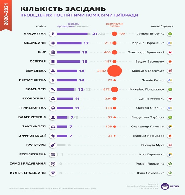 С середины декабря 2020 года идет отчаянная борьба за места под солнцем. Самые популярные комиссии — бюджетная и земельная. Депутаты между собой еще называют их «хлебными». Следует заметить, что бюджетная комиссия провела больше всех заседаний по сравнению с другими — 21, а земельная рассмотрела самое большое количество вопросов — 2882 (данные по состоянию на 15 июля 2021 года).