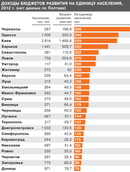 В показателях прошлого года поступления бюджета развития в перерасчете на каждого жителя Черкасс составили 686 грн, тогда как в Одессе - 546, Киеве - 529, Харькове - 420 грн. Любопытно, что самым низким этот показатель оказался в Донецке - всего 79 грн на каждого горожанина. (Впрочем, фактические расходы бюджета развития в столице Донбасса благодаря трансфертам из центрального госбюджета, а также произведенным в конце года уточнениям и перебрасываниям из общего фонда составили в прошлом году 635 грн).