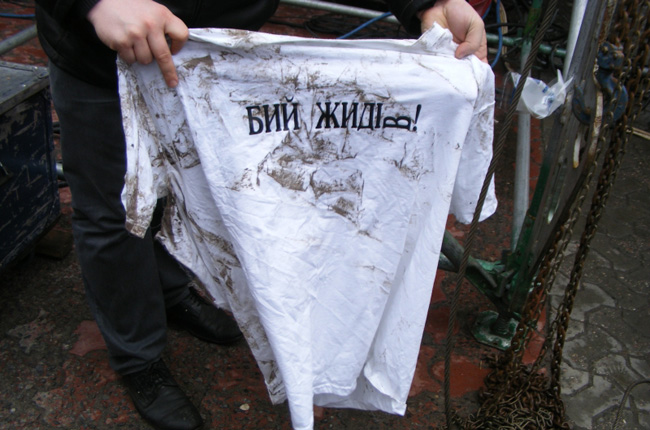 На Театральной площади появилась группа молодых людей в футболках с надписями "ВО "Свобода" на спине и лозунгами "Бий жидів!" - на груди. Организаторы митинга немедленно обратились к присутствующим на мероприятии правоохранителям с требованием задержать парней и принять все необходимые меры. Однако эта задача для милиции, очевидно, оказалась слишком сложной.