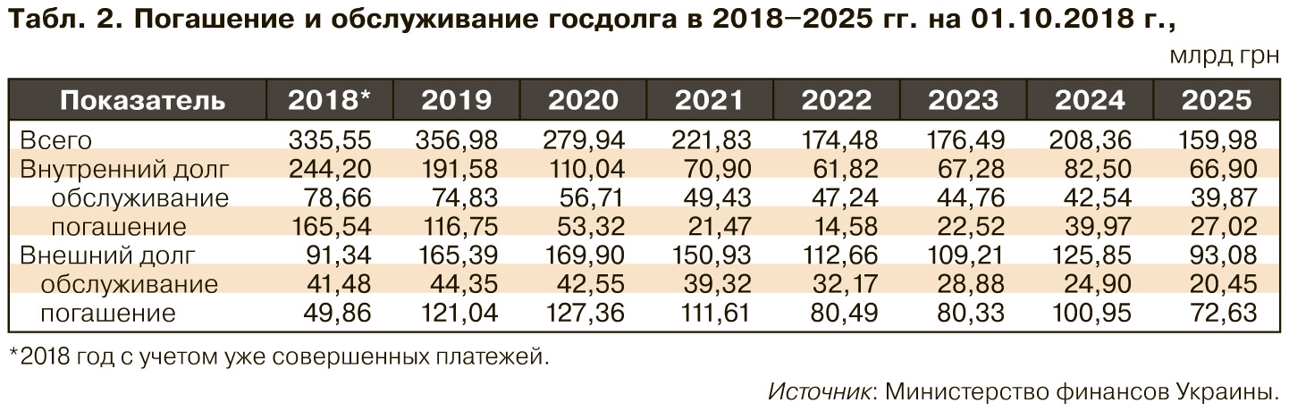 Решая проблемы с пиковыми выплатами в ближайшие годы, Минфин создает проблемы пиковых выплат в будущих периодах. Если посмотреть на график наших выплат по внешним и внутренним долгам (см. табл. 2), очевидно, что до 2025 года ситуация простой не будет. И если правительство не изменит свои подходы к управлению государственным долгом, то и после 2025-го она не улучшится. Беря новые кредиты для выплаты старых, не развивая при этом экономику и не сокращая бюджетный дефицит, Украина лишь откладывает дефолт во времени, но не отменяет его.