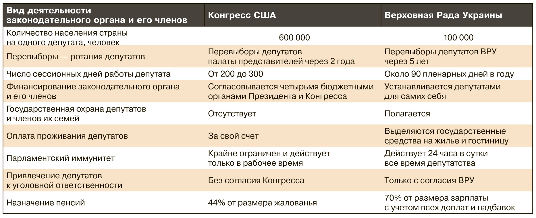 Ниже в таблице приводится ряд важных отличий, характеризующих работу Конгресса США и Верховной Рады Украины.