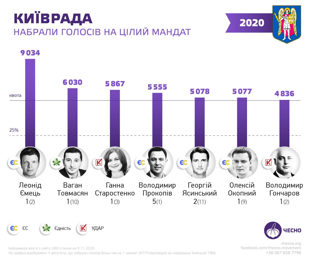 «Цена» мандата в Киевраду в 2020 году составляла 4779 голосов. Депутатов, самостоятельно набравших достаточно голосов на один мандат, семеро. Шестеро из них были депутатами в 2015–2020 годах.