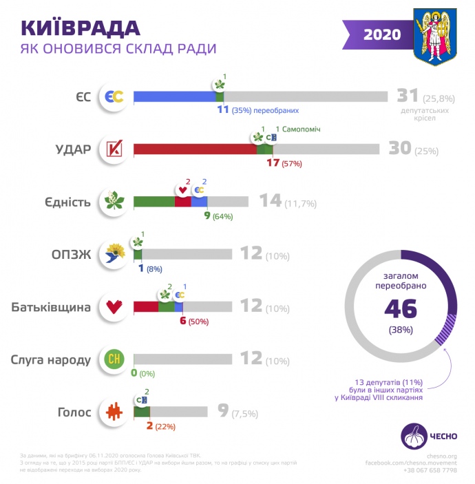 Больше всего переизбранных депутатов у партий «Единство Александра Омельченко», УДАР, «Батьківщина» и ЕС.
