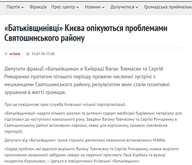 Как видим на скрине с сайта ВО «Батьківщина», партия отчитывается, кого надо благодарить за установленные заборы, скамейки для отдыха и озеленение.