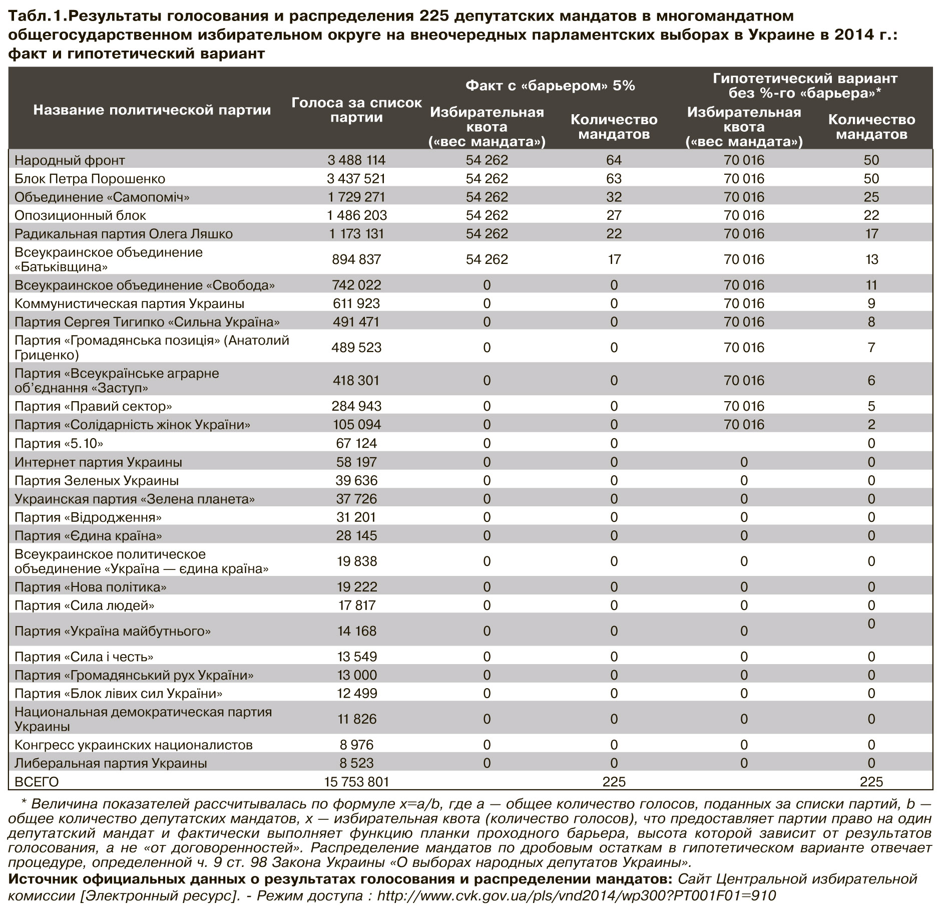Согласно данным таблицы, в 2014 г. были лишены права участвовать в распределении депутатских мандатов партии, за кандидатов которых проголосовали свыше 3,5 млн украинцев - 22,5% от 15,7 млн украинцев, которые участвовали в выборах, и чьи бюллетени были признаны действительными. Поданные ими голоса за близкие им политические партии были, фактически, переданы в пользу партий с другими идеологическими и политическими ориентациями, программными началами и т.п. Можно легко подсчитать величины своеобразного "призового фонда" тех, которые преодолели барьер. Для этого достаточно сравнить результаты фактического распределения депутатских мандатов с гипотетическими расчетами по тому же закону, но без 5-процентного "препятствия": "Народный фронт" - 14 "призовых" мест в Верховной Раде, БПП - 13, "Самопоміч" - 7, Оппоблок - 4.