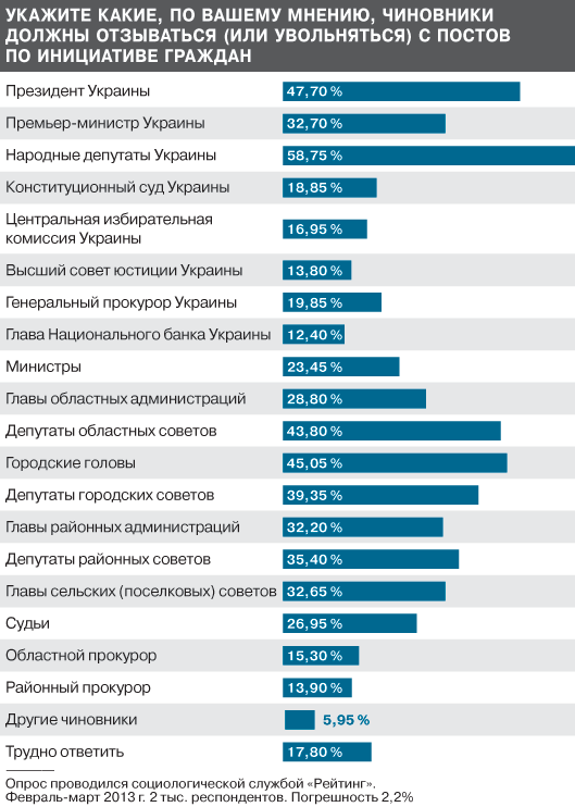 Ситуация в Украине может измениться только при условии формирования ответственного общества и ответственной власти. Граждане изменят свое отношение к политике и власти и возьмут на себя ответственность, когда в их руках будут более реальные и действенные инструменты влияния на власть, чем выборы раз в пять лет и стихийные бунты. Для того чтобы создать новую систему сдерживания и противовесов между обществом и государством, необходимы институты отзыва выборных лиц и вотума недоверия к тем, кто назначается по вертикали власти.