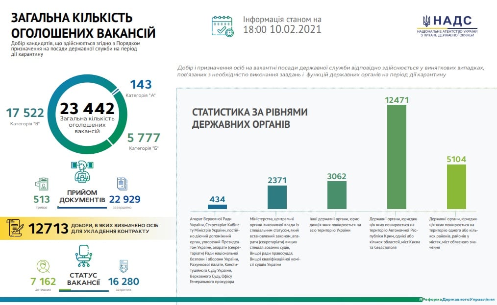 Следует отметить, что по состоянию на 10 февраля с апреля прошлого года вне конкурсов объявлен набор на 23 442 вакансии на должности государственной службы, из них 143 — на должности категории «А» (то есть государственных секретарей, руководителей аппаратов государственных органов, являющихся государственными служащими, и руководителей других органов центральной власти: служб, инспекций и агентств). Согласно законопроекту, конкурсы на должности категории «А» и «Б», назначения на которые состоялись вне конкурса, должны пройти через девять месяцев с момента их возобновления, категории «В» — через 12 месяцев.