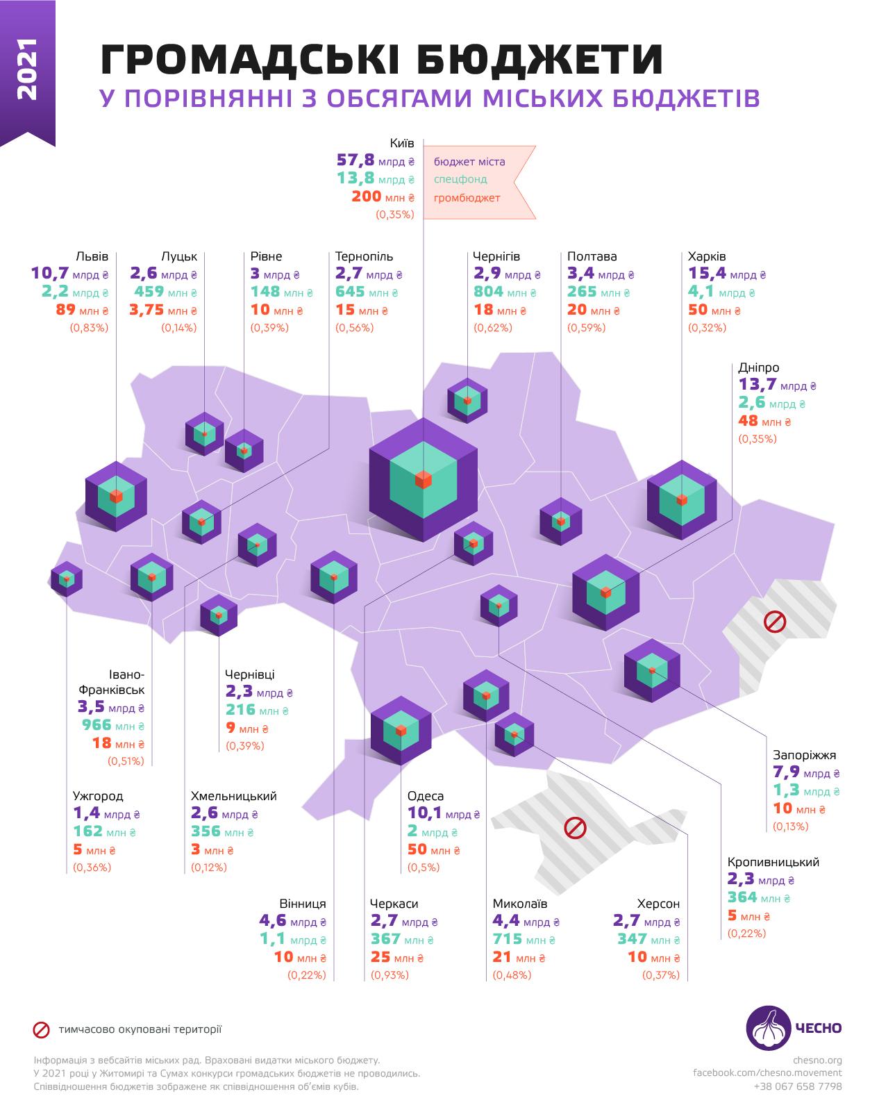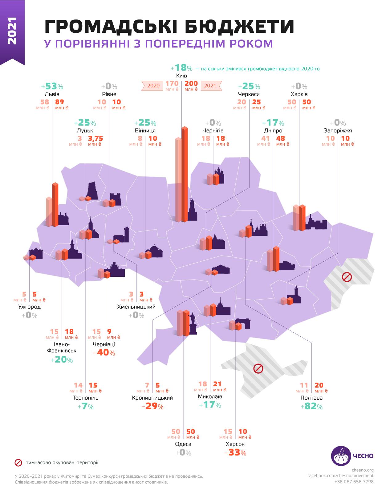 В 2020 году в большинстве крупных городов Украины доля общественного бюджета по сравнению с предыдущим годом выросла. Она колебалась в пределах от 0,06% (Хмельницкий) до 0,51% (Черновцы). В 2021 году эта тенденция продолжилась.