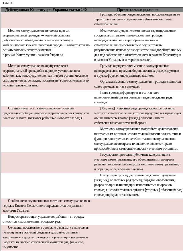 Например, что дает первая часть новой редакции статьи 140 «Громада, которая объединяет население, проживающее на ее территории, является первичным субъектом местного самоуправления»? Нынешнюю первую часть статьи 140 разделили надвое и получили проблему «первичного субъекта». Однако же если есть первичный, то есть и вторичный? А словосочетание «громада, которая объединяет». Объединяет — это как? Нынешняя редакция ч.1 статьи 140 определяет совокупность жителей территориальной громадой по факту, а в новой редакции появляется промежуточное слово «объединяет», что сразу приводит к мысли о необходимости установления некоего факта такого объединения.