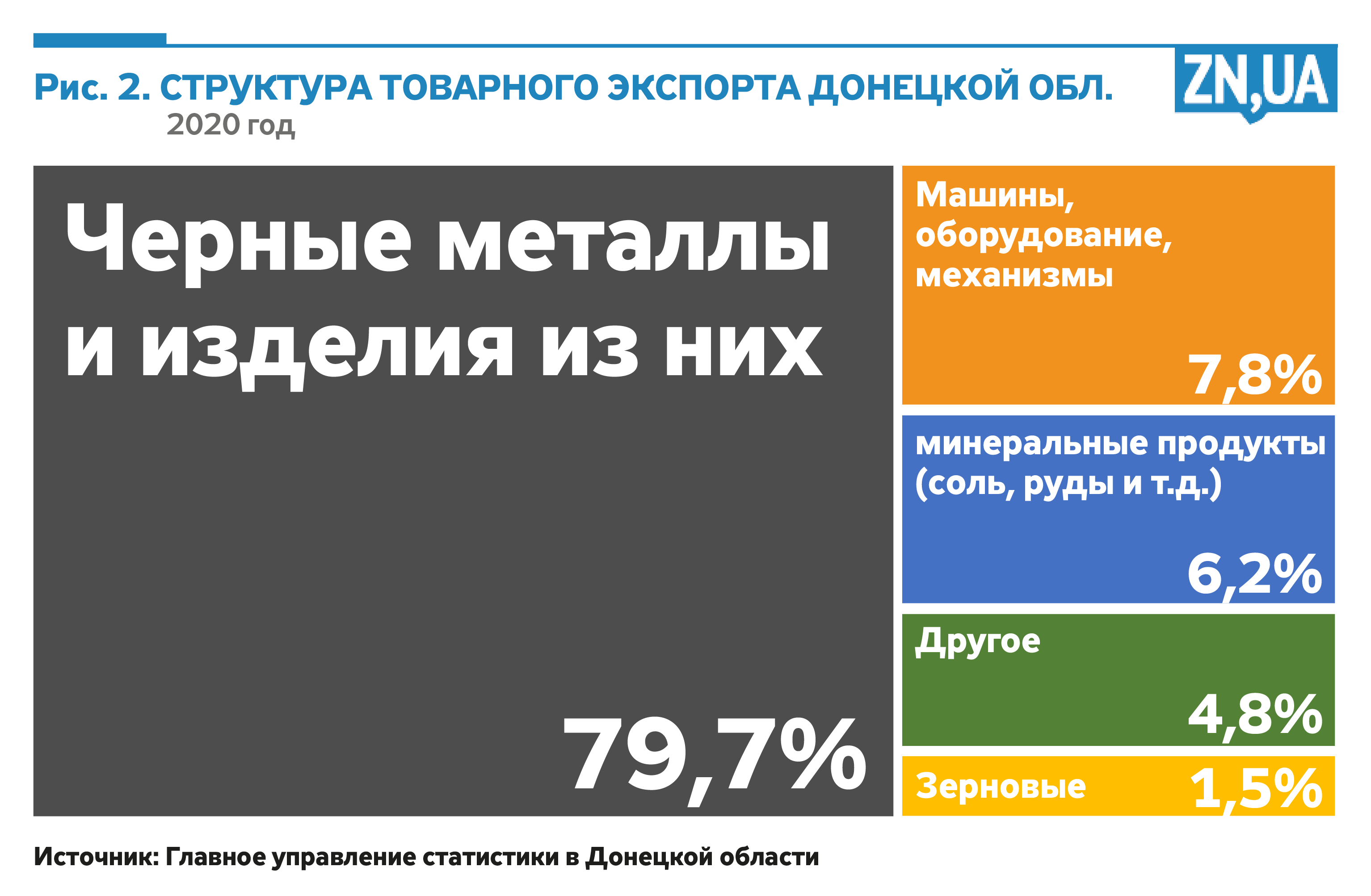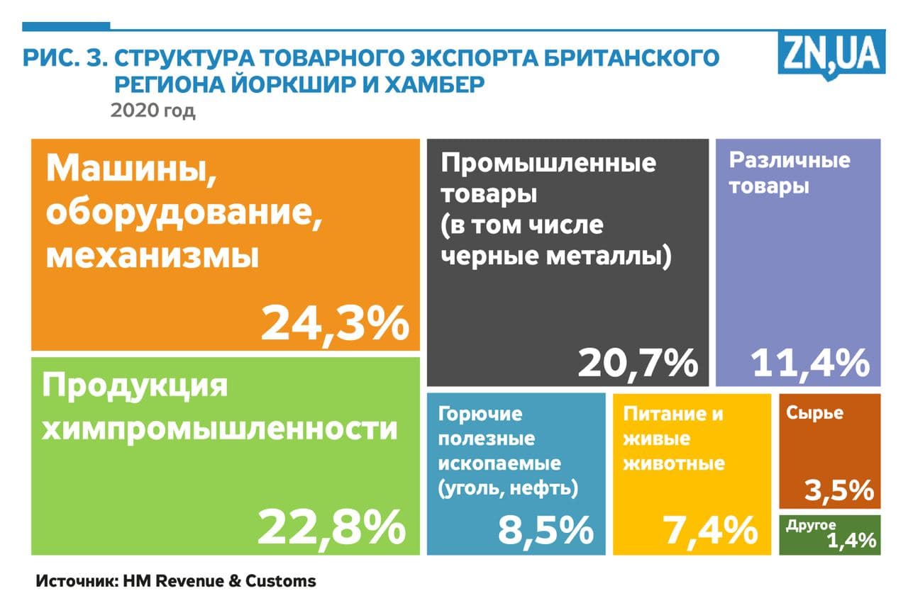 Донецкая и Луганская области до сих пор остаются одними из крупнейших экспортеров Украины, но за последние годы экспорт уменьшился из-за потери традиционных рынков и части предприятий-экспортеров. Экспортный лидер — черная металлургия, не утратившая флагманских позиций. Однако угрозой для региона является крайне низкая диверсификация экспорта: в Донецкой области доля экспорта, не связанного с черными металлами, составляет не более 20%. Это завязывает экспортную выручку на мировые цены на металлы, которые могут довольно сильно колебаться. Ситуацию можно сравнить со структурой экспорта другого традиционно промышленного региона — британского Йоркшира и Хамбера, экономика которого раньше ассоциировалась в основном с углем и черными металлами. Как и в Донбассе, промышленность этого региона в последние десятилетия столкнулась с трудностями, но сейчас у британцев — значительно более диверсифицированный экспорт (см. рис. 2, 3).