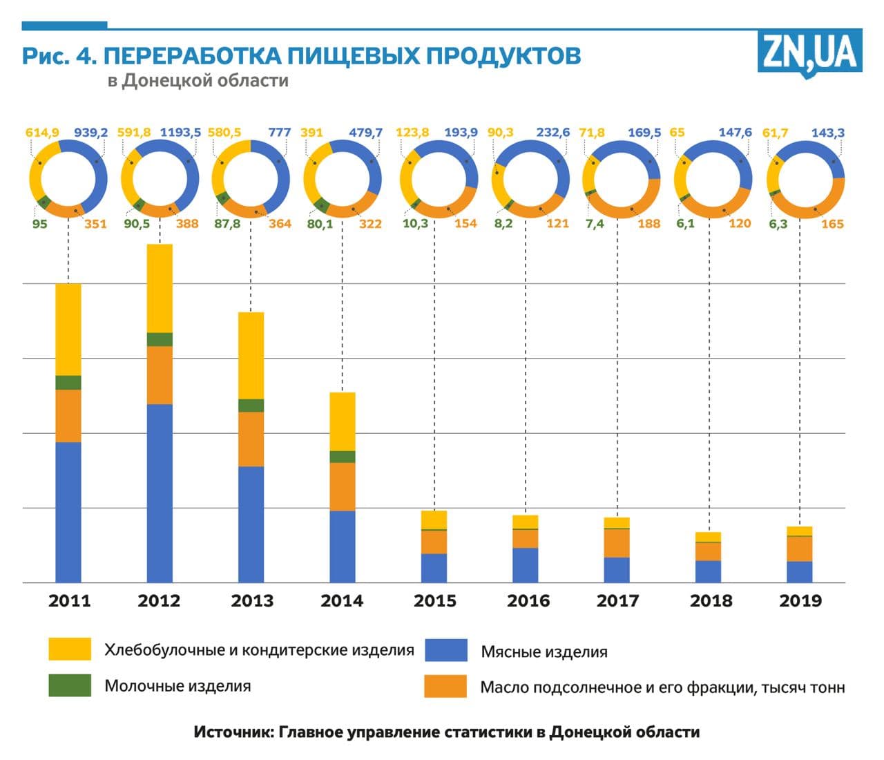 Война привела к увеличению доли сельского хозяйства в структуре выпуска обеих областей, но особенно Луганщины. Последняя неожиданно для себя из индустриального центра превратилась в агропромышленный регион: доля сельского хозяйства в структуре выпуска выросла более чем втрое.
