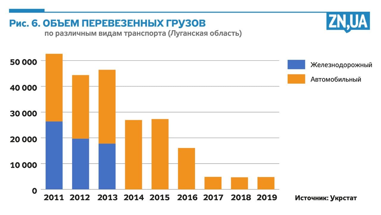 В дополнение к потере железнодорожной ветки блокада оккупированных территорий Луганской и Донецкой областей сильно сократила объем грузов, перевозимых автомобильным транспортом. Главный удар, опять-таки, приняла на себя Луганская область. Меры по транспортной блокаде были приняты на государственном уровне в марте 2017 года. В это же время наблюдается резкое падение объемов грузов, перевозимых автомобильным транспортом. Официальные данные впечатляют: по сравнению с 2016 годом в 2017-м объемы перевозок снизились втрое (см. рис. 6). По состоянию на 2019 год они остаются на таком же низком уровне.