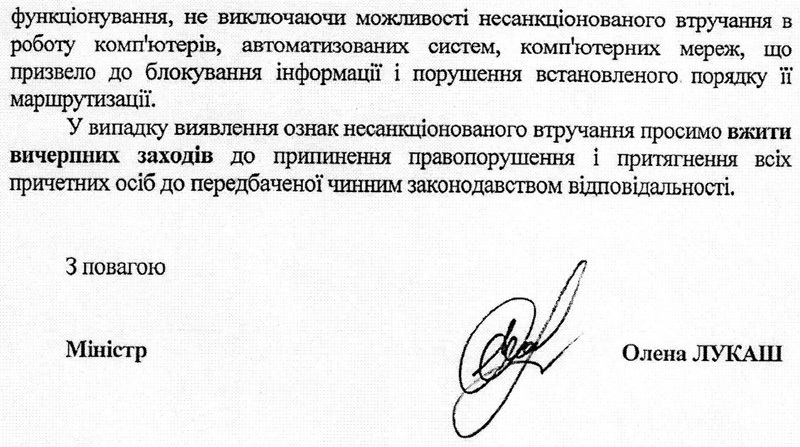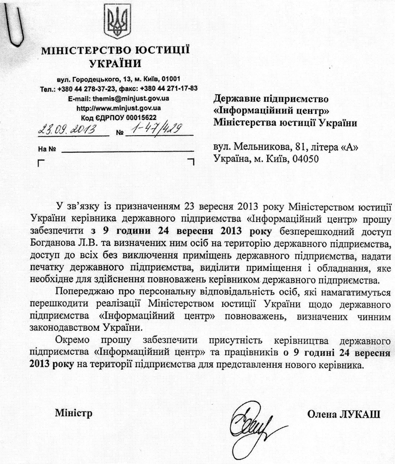 А теперь относительно событий 1 октября 2013 г., когда Министерство юстиции Украины на своем интернет-сайте сообщило о блокировании реестров, обеспечивающих деятельность Государственной регистрационной службы Украины, Государственной исполнительной службы Украины, органов юстиции и нотариусов. Итак, Генеральная прокуратура Украины сообщила о выявлении факта вмешательства в информационные сети Министерства юстиции и открытии по этому поводу уголовного дела.