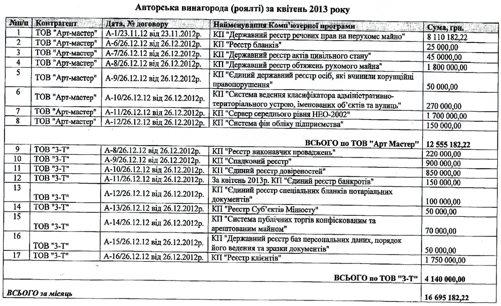 Поводом к нашим расследованиям были материалы проверки КРУ (ныне - Государственная финансовая инспекция Украины), проведенной относительно деятельности государственных реестров в 2009 г. по приказу тогдашнего премьер-министра Ю.Тимошенко, которая разоблачила вопиющие коррупционные схемы в работе министерства, являющегося олицетворением украинской Фемиды. Тимошенко не успела принять решения относительно этой проблемы. ZN.UA впервые сделало достоянием гласности результаты проверки госпредприятия "Информационный центр" Минюста. Сделка заключалась в том, что из 18 государственных реестров, администрируемых "Информцентром", в собственности государства находились только три, а остальные принадлежали "Арт-мастеру" и "3-Т", с которыми "Информцентр" заключил соглашения на пользование программной продукцией без проведения тендеров.