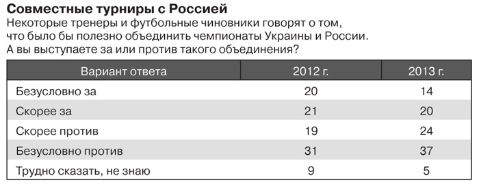 Отношение украинских болельщиков позволяет определить опрос КМИС. "Безусловно, за" высказались 14% (количество сторонников по результатам аналогичного исследования того же социологического центра год назад - 20%). "Скорее, за" - 20% (год назад - 20%). "Скорее, против" - 24% (год назад - 19%). "Безусловно, против" - 37% (год назад - 31%). Количество тех, кто не определился со своим отношением к проблеме, уменьшилось с 9 до 5%. Вывод - число сторонников "укропа" имеет ощутимую тенденцию к снижению. И, судя по всему, будет снижаться и далее.